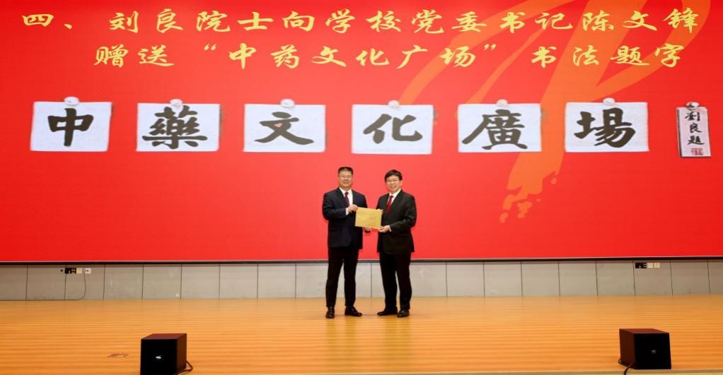 “中药文化广场”由77级中医学专业校友刘良院士题名。11月4日上午,在“刘李中医药创新奖”基金捐赠仪式暨刘良院士报告会上,刘良院士向学校赠送“中药文化广场”书法题字。
