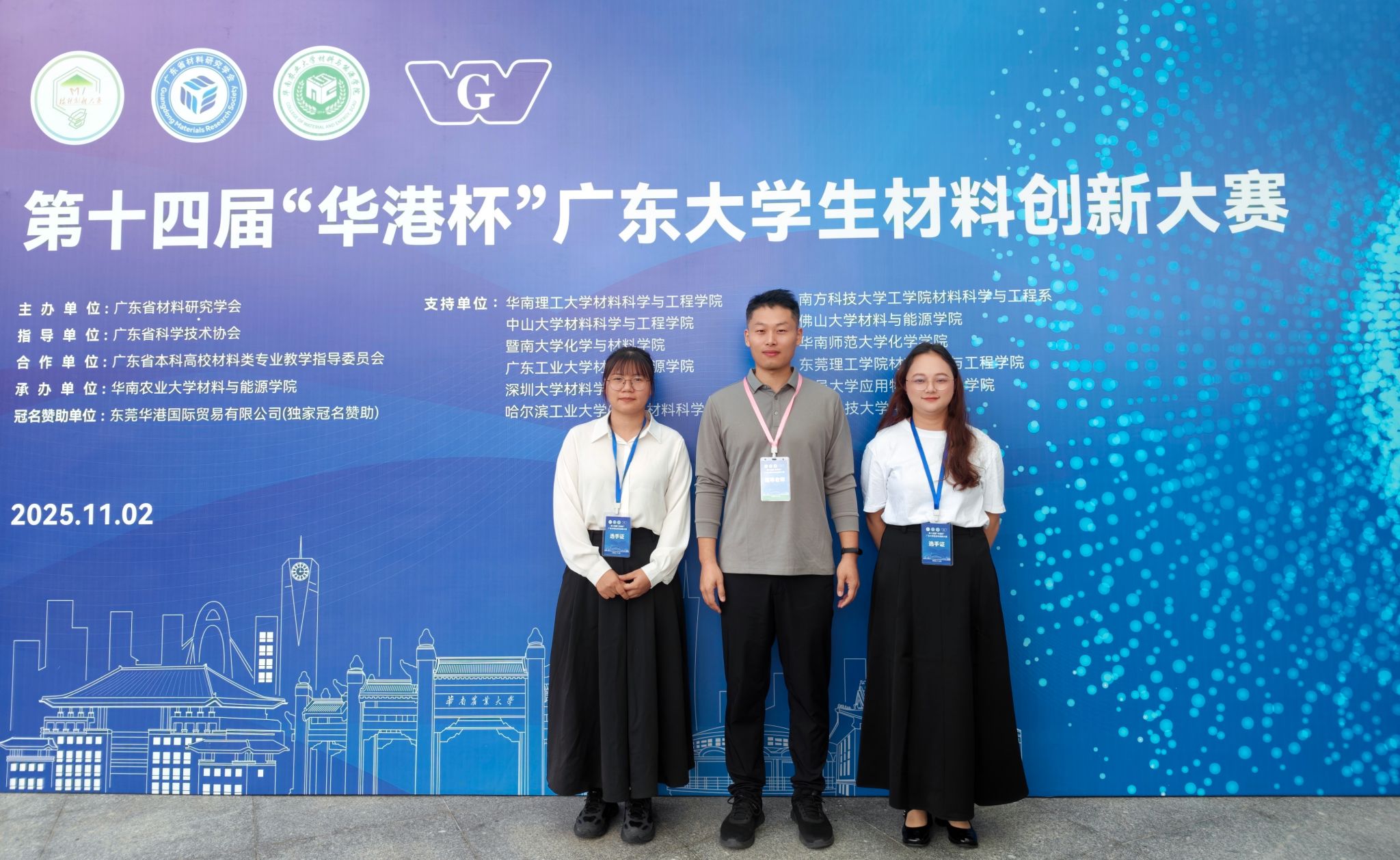 2025年11月2日,第十四届“华港杯”广东省大学生材料创新大赛在华南农业大学丁颖礼堂顺利举行并圆满落幕。本届大赛设立有机和高分子材料、无机非金属材料、金属材料三大分赛区,共吸引全省32所高校的312支队伍、1581名学子报名参与。经过激烈预赛,190支队伍晋级决赛,在决赛舞台上展开精彩角逐。