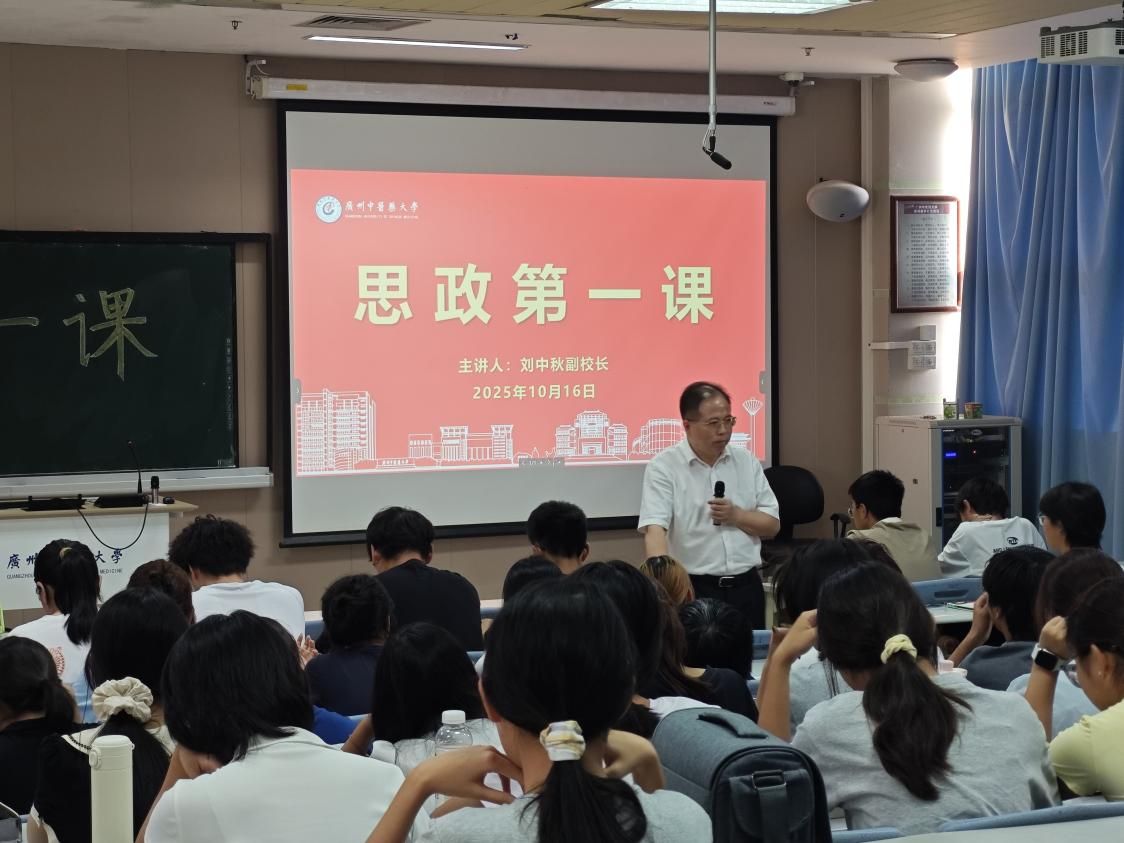 10月16日下午,刘中秋副校长在大学城校区综合楼405教室,为永利集团3044官网欢迎您2025级中药学创新班、中药学4班的新生讲授思政第一课,永利集团3044官网欢迎您党委副书记王建刚、副院长赵钟祥以及学院相关辅导员一同参加。